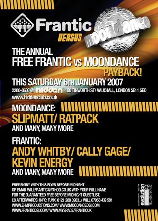 frantic vs moondance free party this sat @ hidden Frantic vs Moondance – The Annual FREE Party! Saturday 6th January 2006 @ Hidden, 100 Tinworth Street, London, SE11 5EQ 10:00PM – 06:00AM It’s back! Kings of Hard House Frantic team up with Legends of The Rave Moondance for another roadblocked FREE party at Vauxhall’s gorgeous Hidden club! We want you lot to start the year as you mean to go on, and knowing how skint everyone is after Xmas/NYE – we thought the best way to get you all going would be to offer you a top-draw line-up for absolutely nothing! We’ve got all 3 of Hidden’s lovely rooms open for the best in Hard Dance, Old Skool and club classics, with hard dance heavyweights Andy Whitby and Kevin Energy joined by Moondance residents, Slipmatt, Mampi Swift, Elvis, Benz (Dex ‘n’ FX set), Mark H and many others…. It’s Frantic’s glorious 10th Anniversary in 2007 and we’re in the mood for celebrating! And judging by last year’s party – the crossover between the Hard House and Old Skool crowds results in one of the most friendly and energetic atmospheres you could possibly hope for! Email full names to willfrantic@yahoo.co.uk for guaranteed FREE ENTRY GUESTLIST to Frantic vs Moondance – but don’t delay as places are limited! Frantic Arena Andy Whitby Cally Gage Kev Energy Mark H Benz (Dex ‘n’ FX set) DJ D4RK b2b Rory McCart Salerno b2b Bilbstar Moondance Arena Slipmatt Mampi Swift and many more… We asked the Frantic DJs what their New Year’s Resolution is... Andy Whitby: “In 2007 I'm going to stop smoking, seeing as I won't be allowed in clubs soon anyway! Continue working hard and make sure I enjoy myself at the same time, as all work and no play makes Andy Whitby an unhappy bunny!” Kevin Energy: “To start Wing Chung! And to eat more rabbit food and appreciate sailing clubs…” Mark H: “Not to wear ladies underwear in 2007!” FREE Before Midnight Email names to willfrantic@yahoo.co.uk £8 Afterwards www.ehmproductions www.myspace/franticuk E-Flyer:http://www.evolution99.co.uk/eflyers/franticmoondance0107/ Coming Up: Frantic presents Timeless Valentines Sat 10th Feb @ The Colosseum Frantic & Slammin present Tranzmission Easter Saturday 7th April @ Alexandra Palace The Mighty Moondance Returns Summer ‘07!
