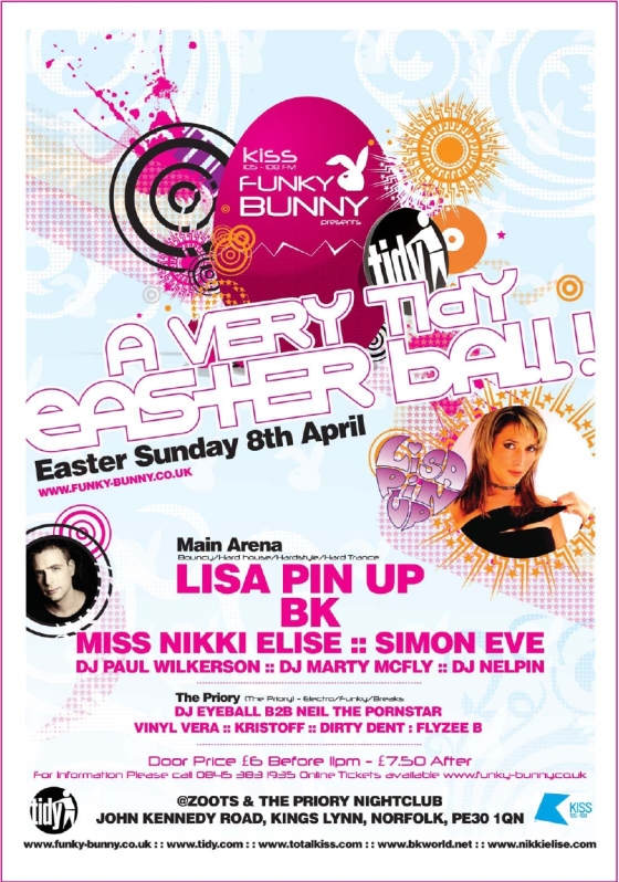 funky bunny the easter ball april 8th Funky Bunny Presents a Very Tidy Easter Ball! Easter Sunday 8th April @Zoots & The Priory Nightclub, John Kennedy Road, Kings Lynn, Norfolk, PE30 1QN Funky Bunny’s favourite time of the year! As we go Full on Bunny Time! We bring you a mega Easter treat! After the lost of the Xmas Party we bring you a huge Treat for Easter to kick start 2007 in style! We have put together one of the best Line ups ever to hit Kings Lynn! We bring to you two of the biggest Names in Hard Dance! The Superstar Legend that is Lisa Pin Up!! And The Legend that has been top of his game BK! Alongside some of the Hottest Talents in East Anglia and the Midlands! Main Room - Bouncy/Hard house/Hardstyle/Hard Trance Lisa Pin Up The Worlds No.2 Female Hard Dance Dj! Lisa Pin-Up is the stuff off legend in hard dance circles, having cut out her own niche in the market with energetic DJ sets of skilful mixing and anthemic sounds making her a clubbers favourite and near permanent fixture in the DJ Mag Top 100 DJs. She’s also notched up an impressive catalogue of best selling DJ mix compilation CDs and 12” single releases on leading labels, and off the decks her bubbly personality and stunning looks have also won over legions of fans and made her a media favourite, starring on countless magazine covers and making her one of the most familiar faces in dance music, and one of a select few DJs that can genuinely be described as a household name. BK Winner of Best Track & best producer at the Hard Dance Awards! Ben Keen, best known to dance fans the world over as BK, is one of the most prolific DJ / producers of the past decade. As in house producer at Nukleuz, he wrote, co-wrote and remixed over 70 releases, single-handedly shaping the sound of hard dance in the mid nineties long before he'd even seriously contemplated DJing. It wasn't long before BK the producer tried his hand at being BK the DJ - after all, there's only so long you can turn down offers to tour Asia, Australia, Africa, America and Europe without becoming curious... Simon Eve (Tidy’s very Own Manager, Recharge) Miss Nikki Elise (House of Elise, Kiss FM, Funky Bunny Resident) Dj Paul Wilkerson (Resident, BIG) Dj Marty Mcfly (Funky Bunny) Dj Nelpin Room 2 (The Priory) - Electro/Funky/Breaks Dj Eyeball B2B Neil The Pornstar Vinyl Vera Kristoff Dirty Dent – Flyzee B Funky Bunny Dancers - Full Funky Bunny Club Décor - Angle Grinding - POI Dancing – Sexy Cyber Bunny Girls – Full on Laser Display – 3d Visuals & More! ONLY £6 Advanced Tickets Available online www.funky-bunny.co.uk Or Door - £6 Before 11pm /£7.50 After Plus The new Funky Bunny Merchandise Stall - Full all your Funky Bunny Merchandise, Glowsticks/Glow Bunny Ears/glasses and more!! & Laughing Gas! www.funky-bunny.co.uk - www.tidy.com – www.totalkiss.com - www.bkworld.net – www.nikkielise.com - www.simoneve.com www.thundermental.co.uk