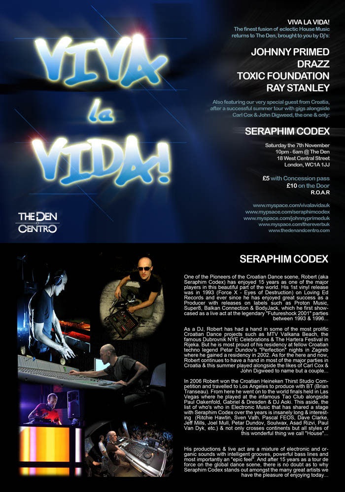 Hot off the back of our 1st successful party at our new home THE DEN in October, VIVA LA VIDA sees the 2nd instalment on Saturday the 7th of November. Thrilling you on the night you with their delectable deck skills are resident Dj's JOHNNY PRIMED & DRAZZ and the legendary RAY STANLEY. Accompanying them are winner of the Felix Da House Cat "We All Wanna Prince" remix competition TOXIC FOUNDATION & also after his successful summer tour with gigs alongside the likes of Carl Cox and John Digweed, the one & only SERAPHIM CODEX. Kick off is @ 10pm, so be there early to ensure entry to another rockin' night at VLV. See Y'all there,